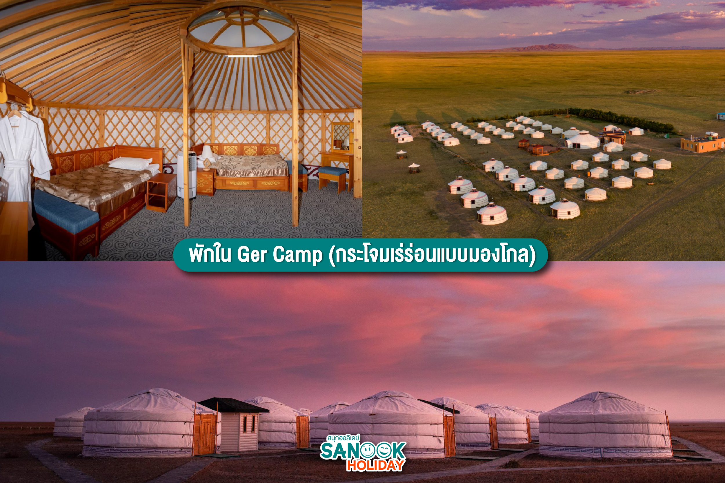 - ที่พัก: สัมผัสประสบการณ์นอนใน "Ger" (กระโจมแบบมองโกเลีย) ที่ Sanook Holiday คัดสรรระดับ Luxury มาให้ มีห้องน้ำในตัวและสิ่งอำนวยความสะดวกครบครัน ท่ามกลางคืนที่ดวงดาวเต็มท้องฟ้า