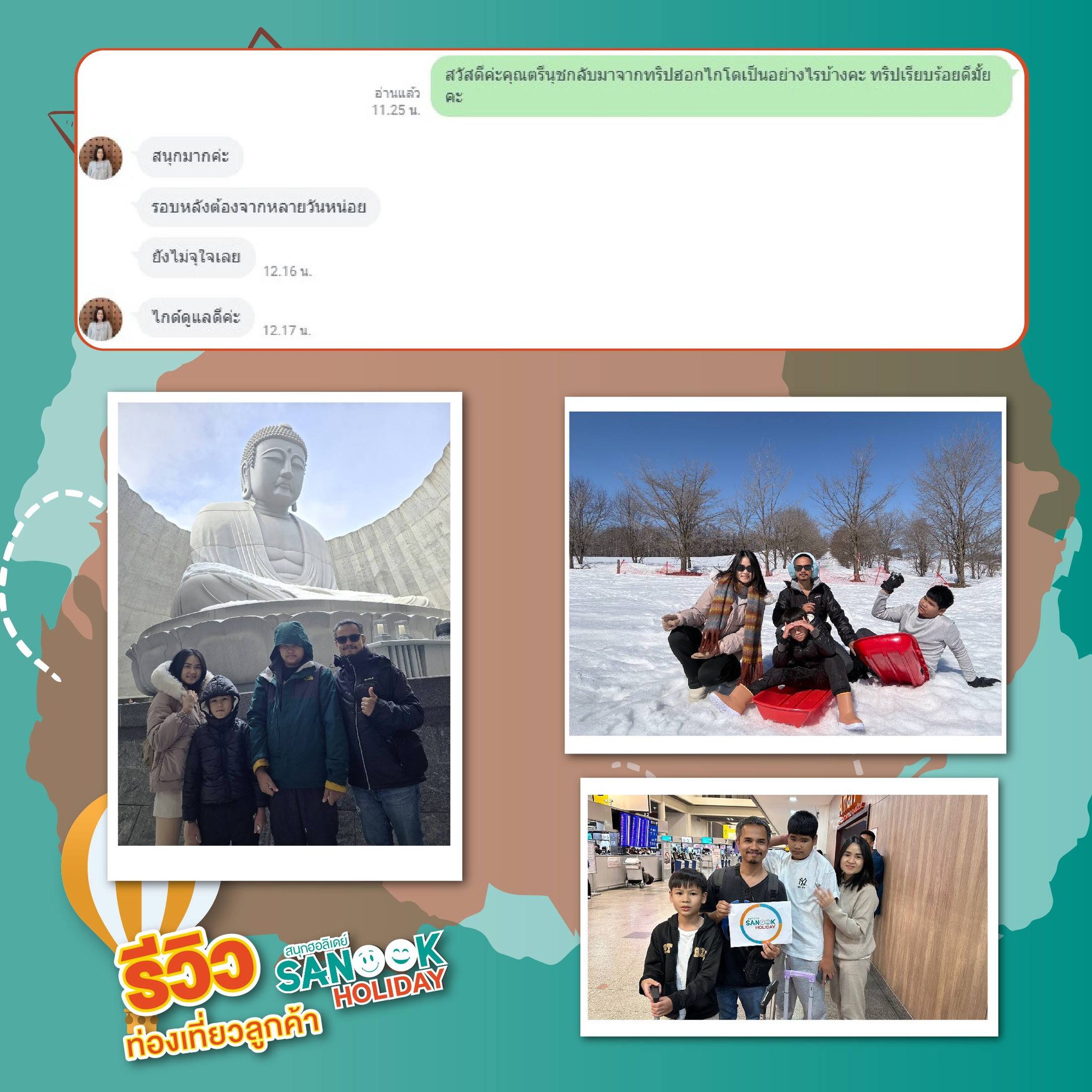 [มีนาคม 2569]สนุก ฮอลิเดย์ (Sanook Holiday) ผู้เชี่ยวชาญการจัดนำเที่ยวเส้นทางญี่ปุ่นพรีเมียม เผยภาพความสุขหลังจบการเดินทางโปรแกรมจอยทัวร์ยอดนิยม "BT-CTS_W07_XJ มหัศจรรย์...HOKKAIDO สโนว์วินเทอร์" ระหว่างวันที่ 24 - 28 มีนาคม 2569 โดยได้รับเกียรติจาก คุณตรีนุชและครอบครัว จำนวน 4 ท่าน ร่วมเดินทางไปสร้างความทรงจำสุดพิเศษ